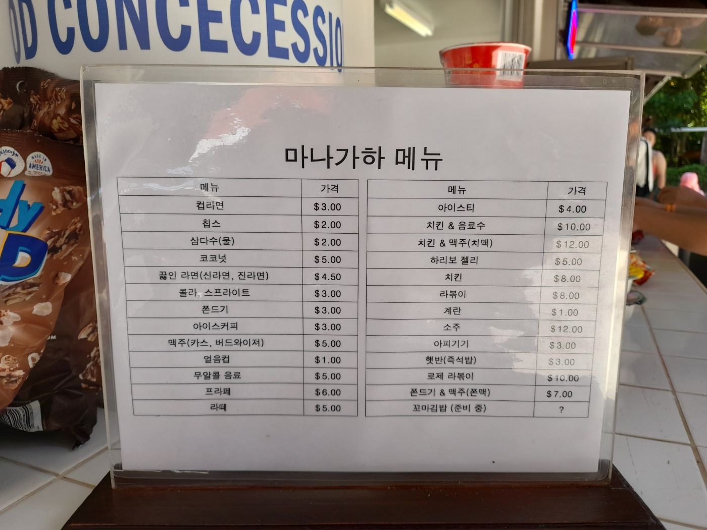 메뉴는 한끼 식사라기 보다 간식거리라고 보는게 맞을 것 같고요, 아직은 마나가하 섬 투어 하시려는 분은 도시락을 준비하시면 좋겠습니다.
